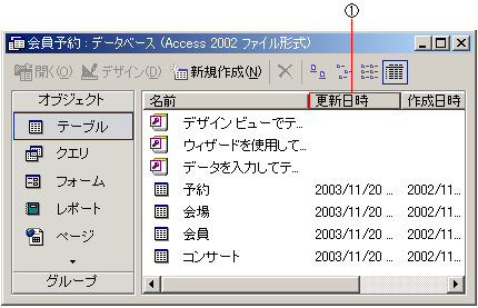設問 3. <図1>はデータベース ウィンドウである。図の@部分をクリックすることにより、「更新日時」に関する項目を非表示にすることができる。