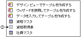 設問 4. <図2>はデータベース ウィンドウの一部であり、「資格取得表」テーブルは「隠しオブジェクト」に設定されている。このとき、図のAのテーブルをダブルクリックすると、「資格取得表」テーブルをデータシート ビューで表示することができる。このとき、「資格取得表」テーブルの[既定のビュー]プロパティには「データシート」が設定されているものとする。なお、<図2>のデータベースは、隠しファイルが表示される設定となっているものとする。