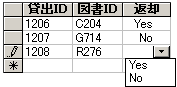 設問 4. <図3>はテーブルのデータシート ビューの一部で、「返却」フィールドはYes/No型のフィールドである。「返却」フィールドについて、デザイン ビューの[ルックアップ]タブにおいて、[表示コントロール]プロパティの値はに設定されている。
