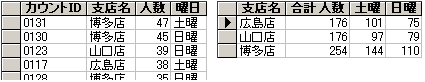 設問 1. <図1>はテーブルのデータシート ビューの一部である。<図1>のテーブルを基に<図2>のクロス集計クエリを作成する場合、クロス集計クエリ ウィザードにおいて、行見出しとして使うフィールドに「支店名」フィールド、列見出しとして使うフィールドに「曜日」フィールド、集計する値があるフィールドにフィールド、集計方法に「合計」を設定する。