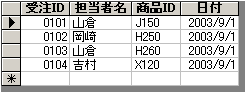 設問 2. <図3>はテーブルのデータシート ビューである。<図3>のテーブルを基に「担当者名」フィールドと「商品ID」フィールドを表示する選択クエリを作成し、クエリの[固有の値]プロパティを「はい」に設定してクエリを実行すると、件のレコードが表示される。