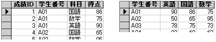 設問 3. <図4>はテーブルのデータシート ビューの一部、<図5>は<図4>のテーブルを基に作成したクロス集計クエリのデータシート ビューの一部で、「学生番号」フィールドの値別に、「科目」フィールドの値ごとの「得点」フィールドの値を集計したものである。このとき、列見出しに設定されたフィールドはである。