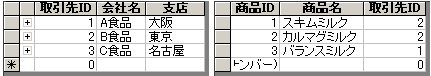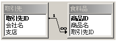 設問 4. <図2>および<図3>はテーブルのデータシート ビューである。また、<図2>の「取引先」テーブルと<図3>の「食料品」テーブルには<図4>のリレーションシップが設定されている。このとき、「取引先」テーブルの「取引先ID」の値が「1」のレコードを削除することはできない。ただし、レコードの連鎖削除は設定されていないものとする。
