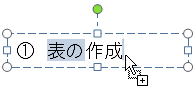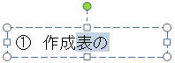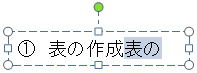 設問 1. <図1>のテキストボックスの文字列「表の」を選択し、Ctrl キーを押しながらマウスを文字列「作成」の末尾にドラッグすると、 のように表示される。