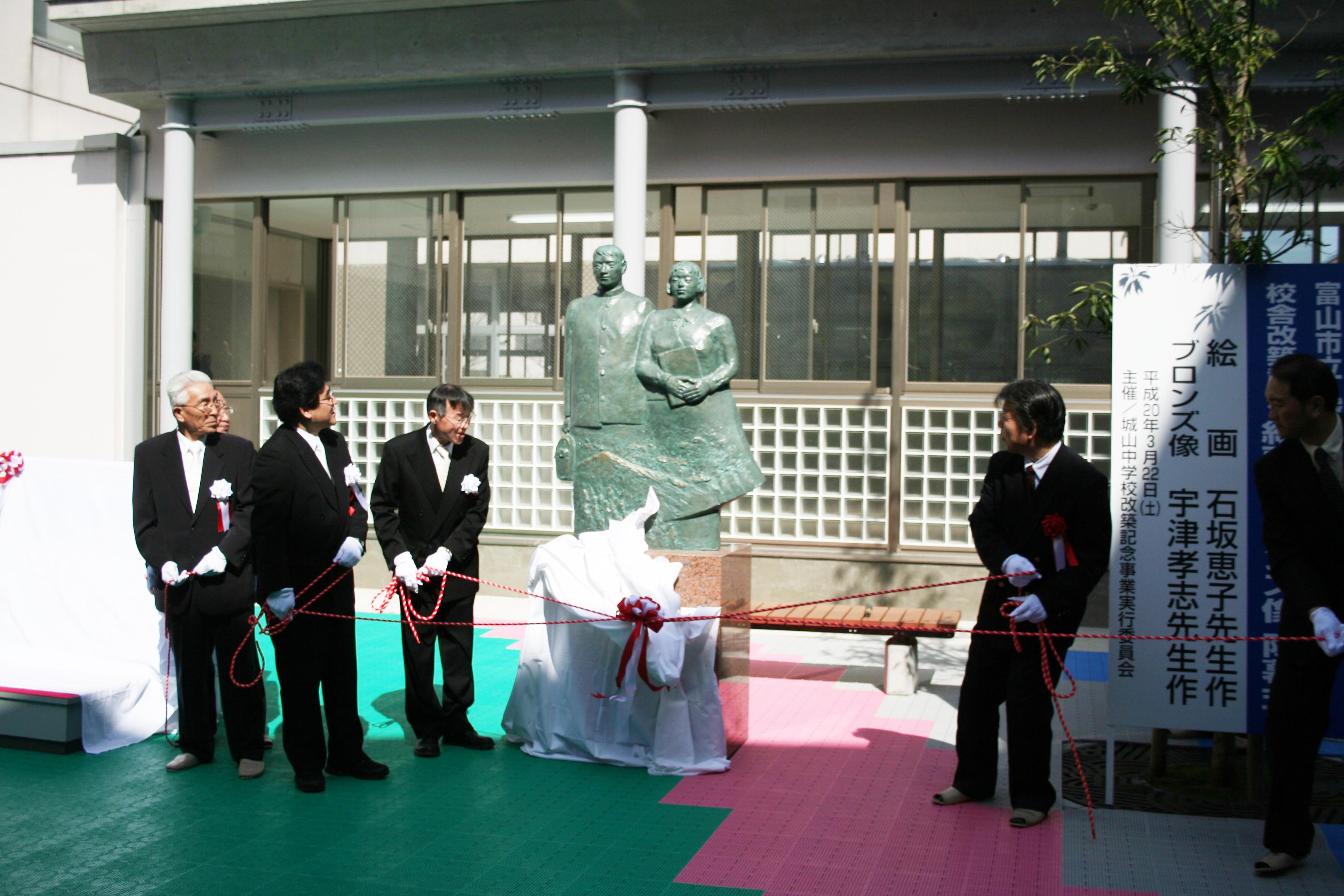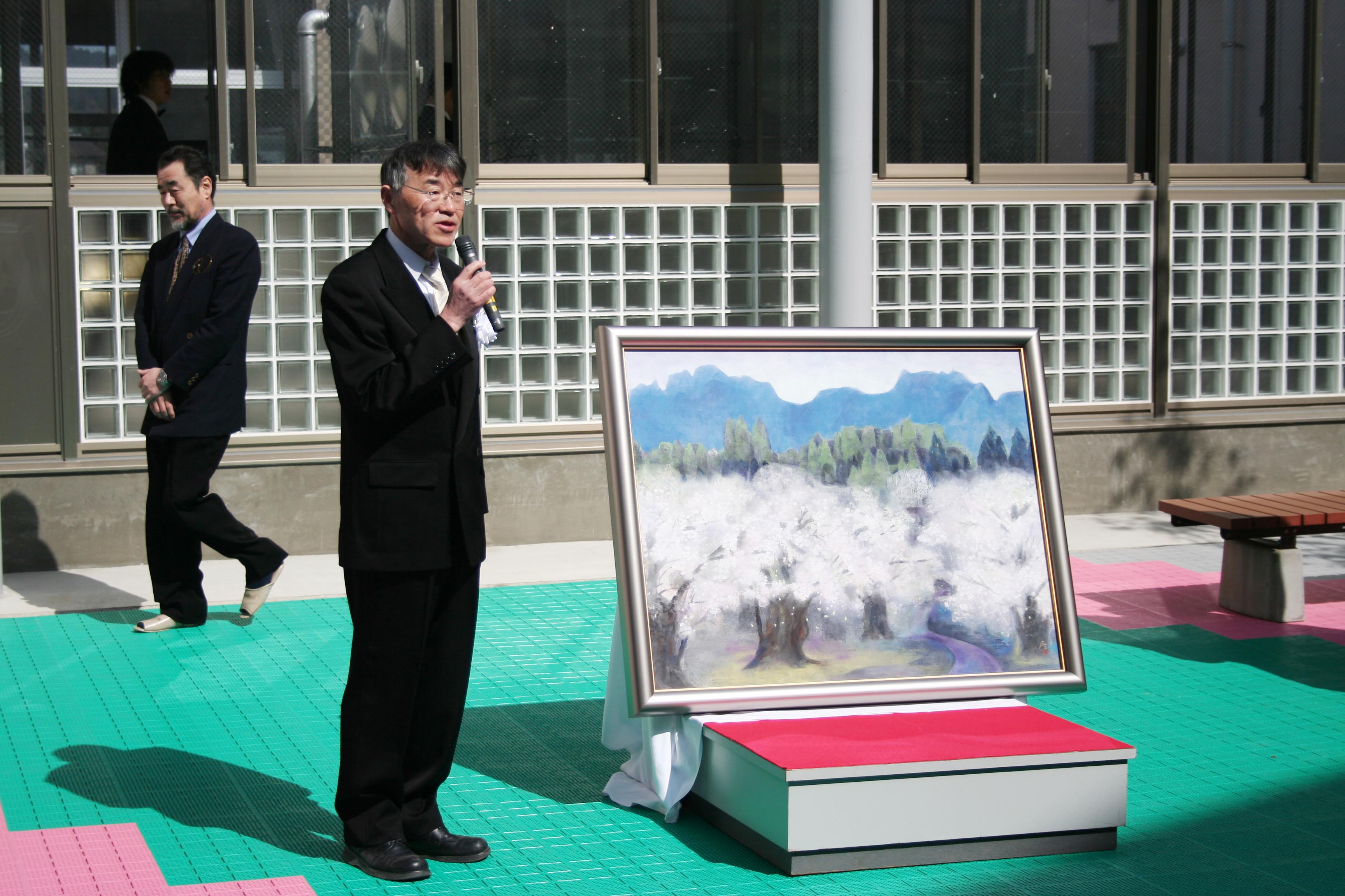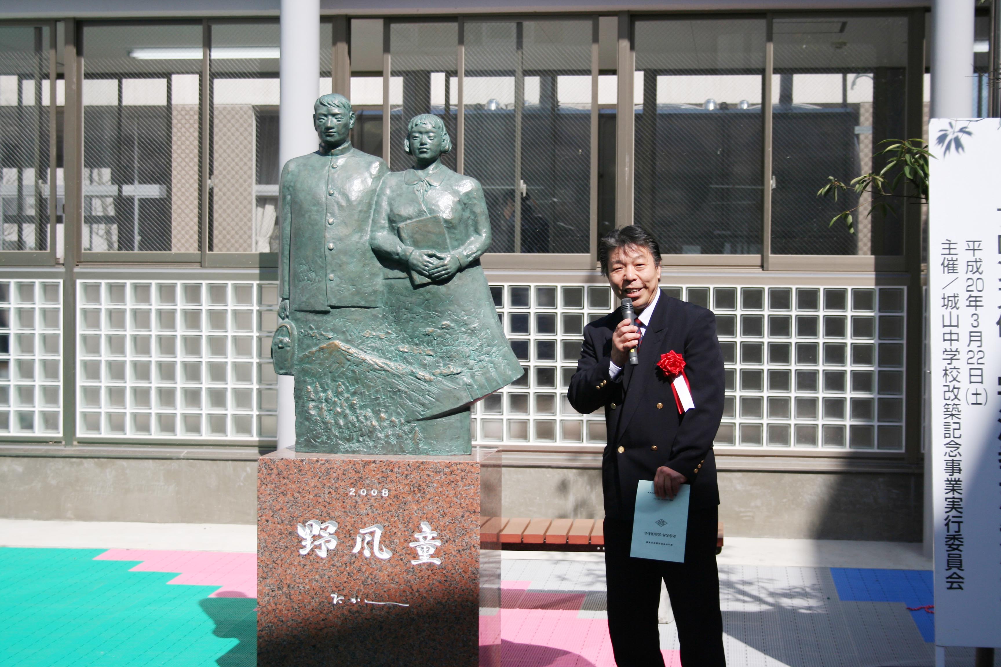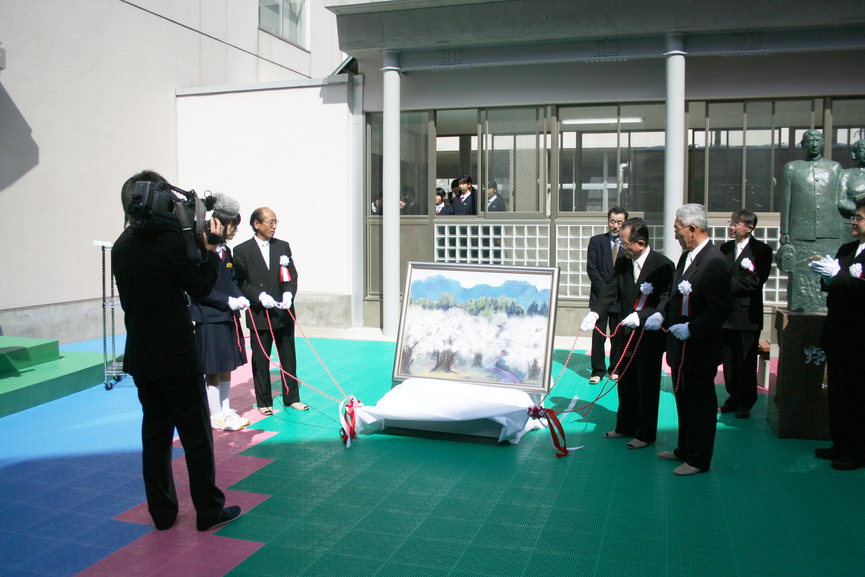 10時からの除幕式では、中庭に設置された宇津孝志氏作のブロンズ像と石坂恵子氏作の絵画がご披露され、ブロンズ像は、「野風童」、絵画は「城山の春」と名づけられました。