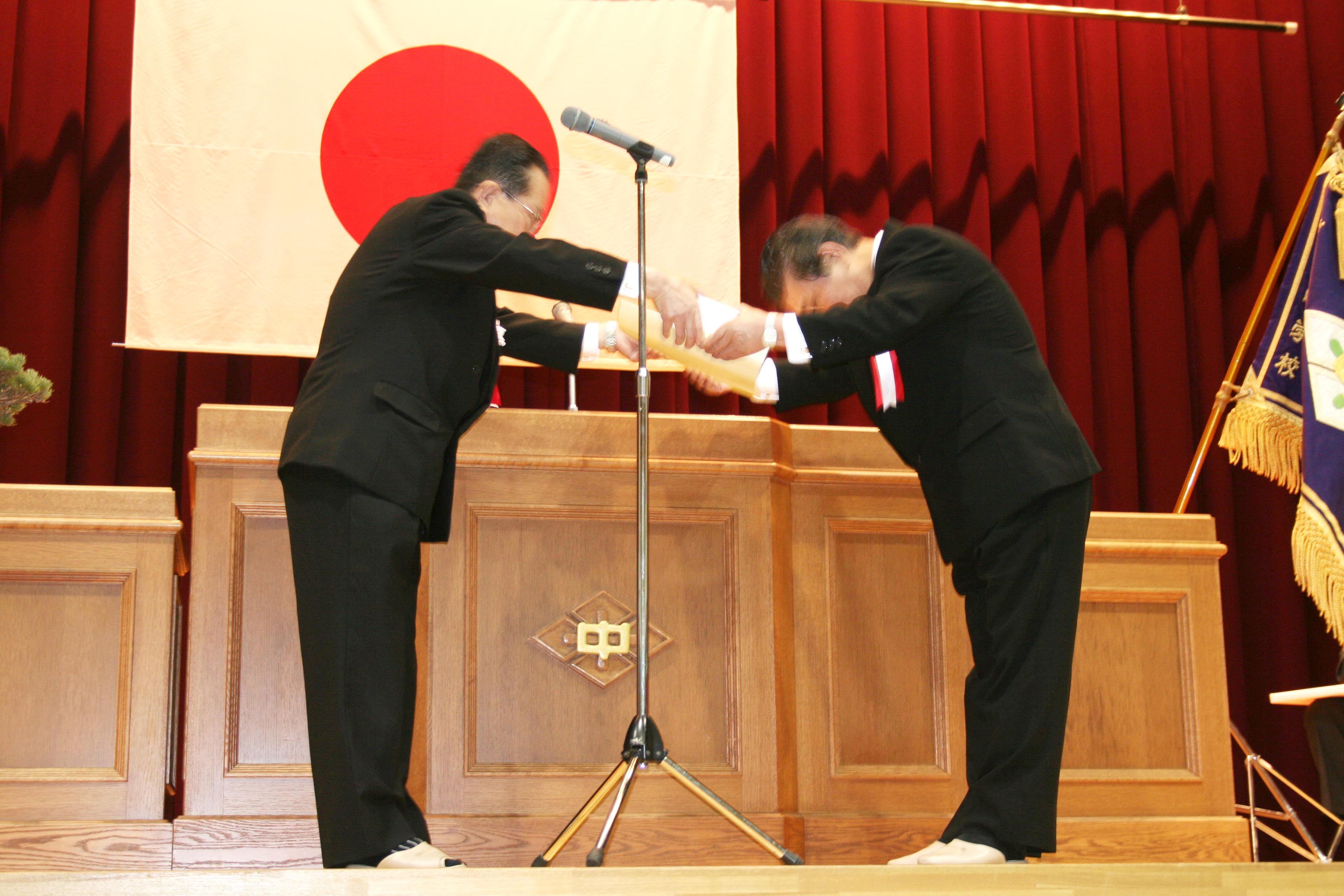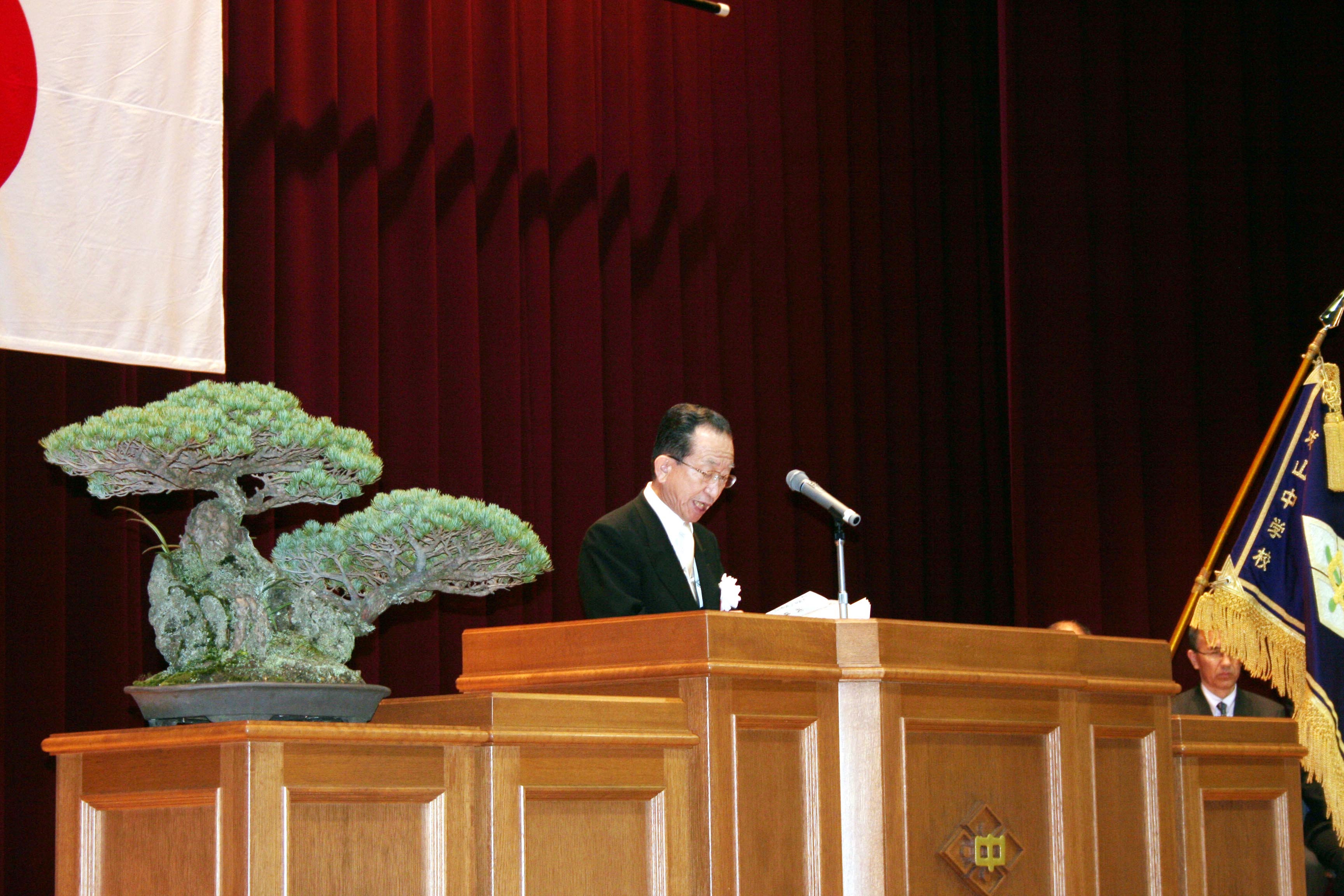 祝電被露の後、中谷副会長(PTA会長)から記念品目録贈呈がありました。 そして校舎改築および募金に協力していただいた方々への感謝状贈呈があり、安井校長、生徒会長椎名恭子からは謝辞がありました。 最後に校歌斉唱で閉会となりました。