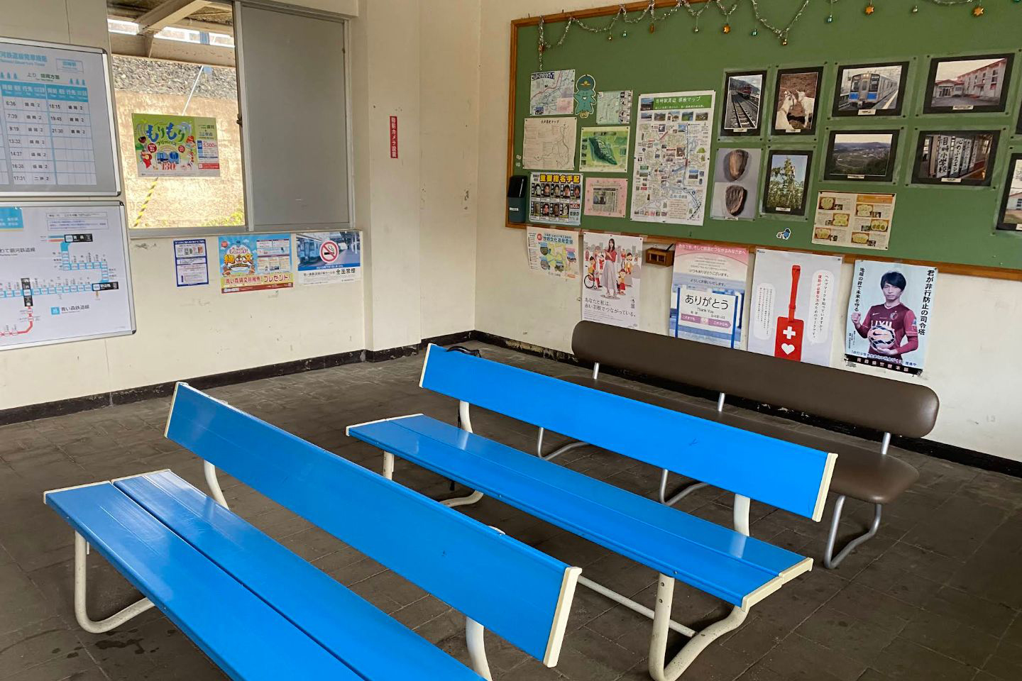 なお、上り線ホームには屋根付きの待合室があるが、下り線ホームには、階段を昇ったところにいすが4席分あるのみである。
