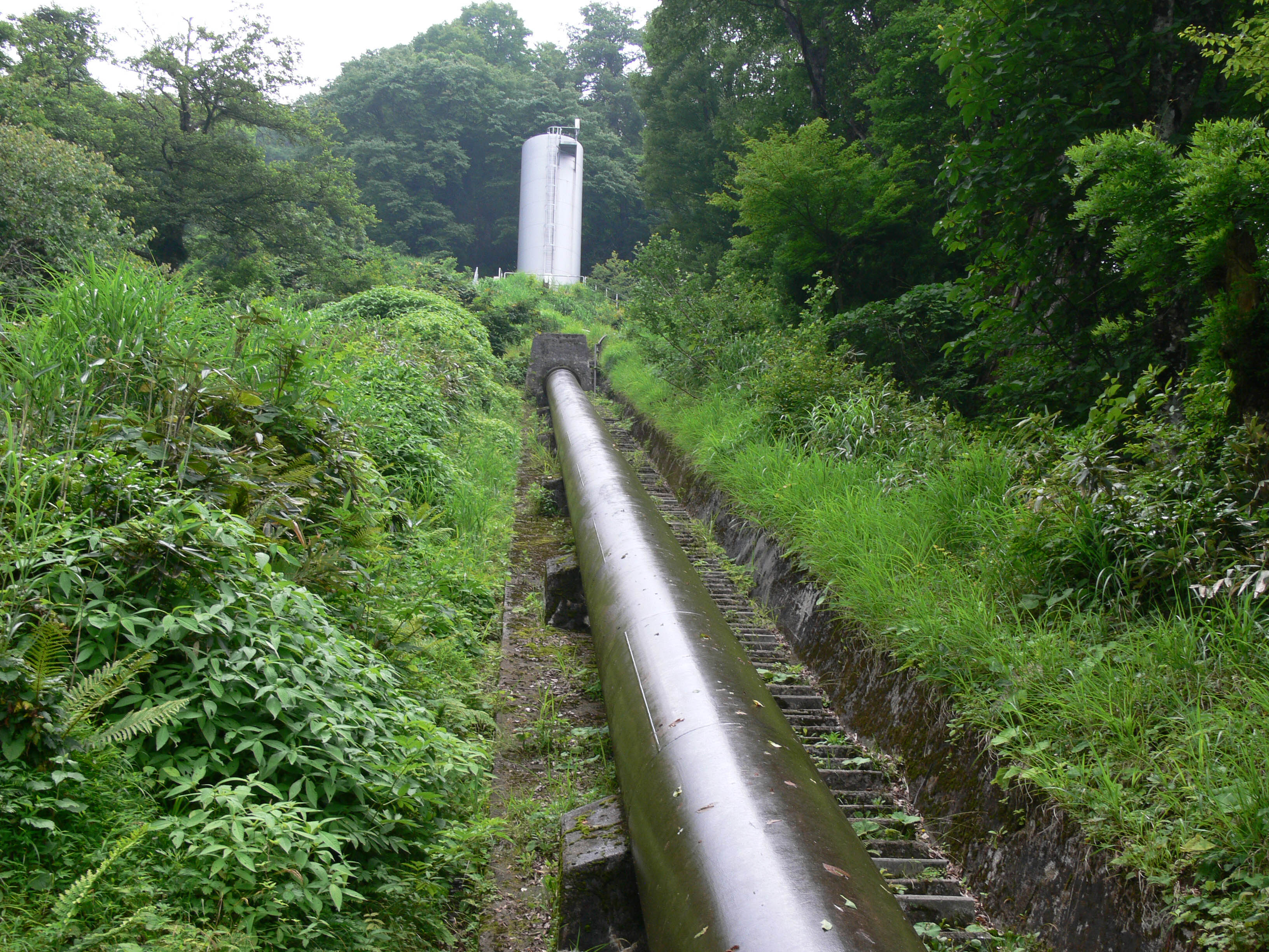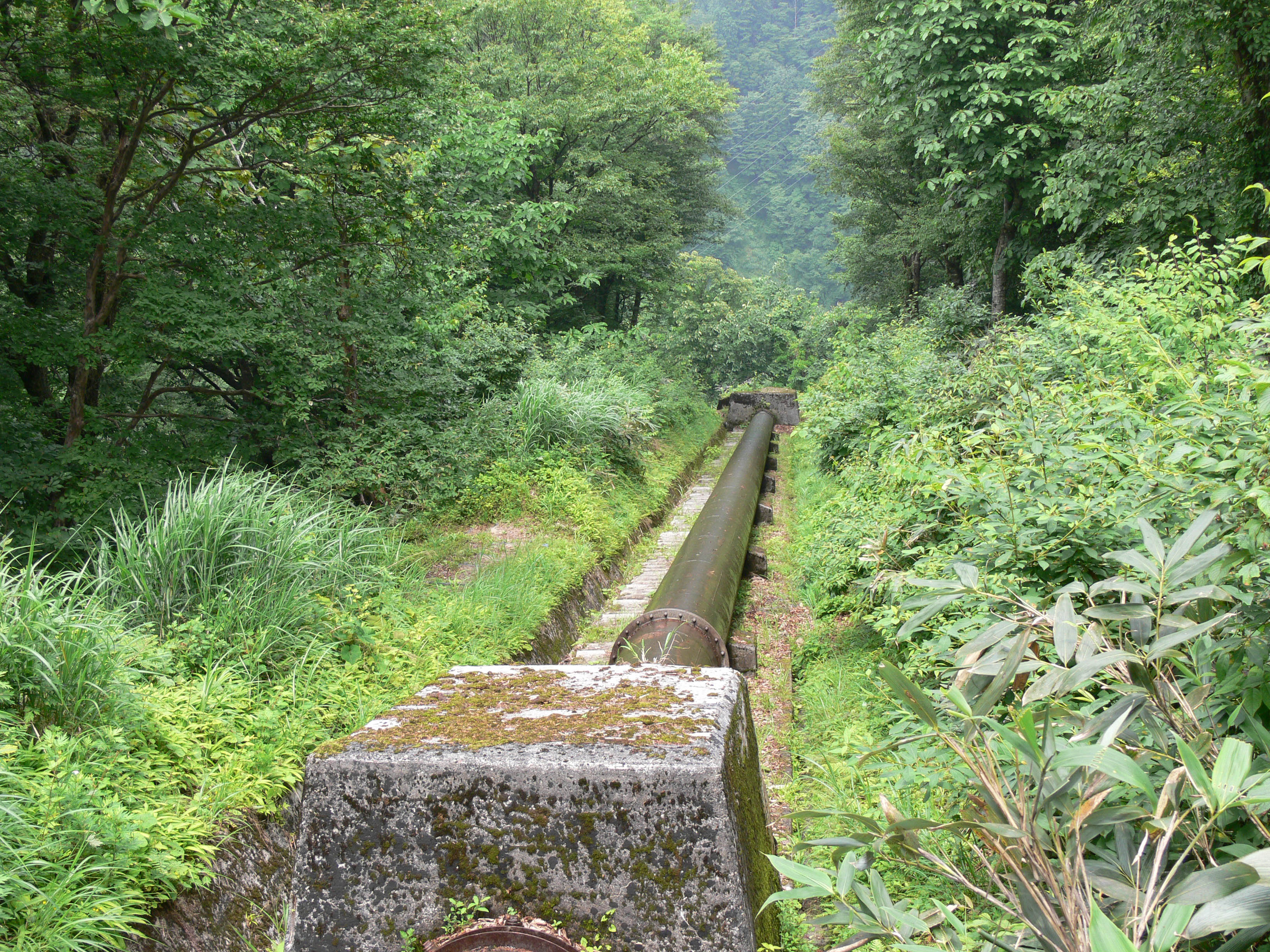 水圧鉄管を跨ぐ橋の上から下を見下ろします |
