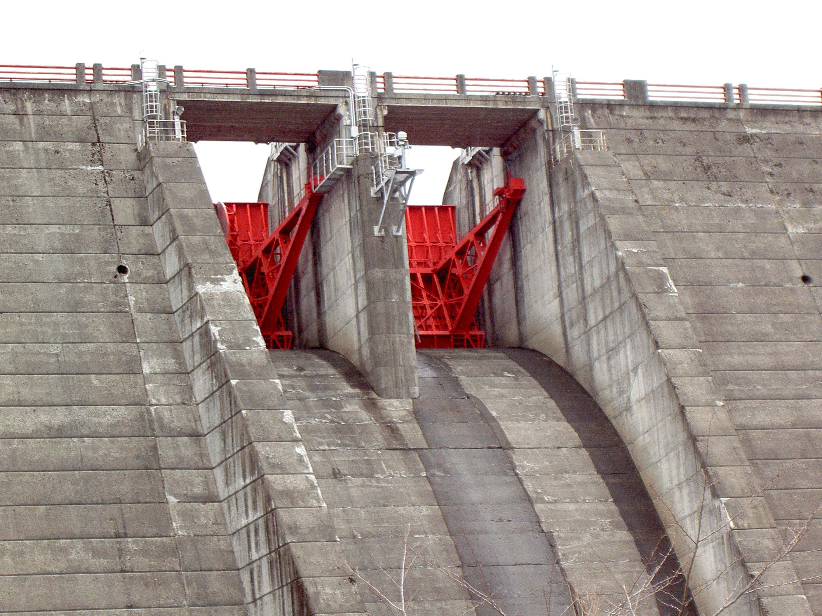 このダムの特徴のひとつとして、クレストゲートからの導流部がかなり高い位置でジャンプ台になっていることで、放流時にはここで水が大きく派手にジャンプして迫力充分です。