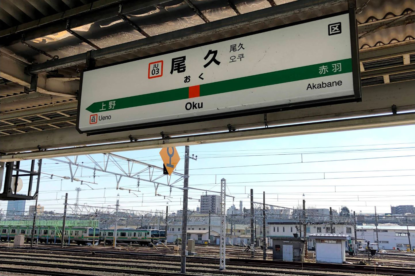 駅北東の地名「尾久」(荒川区東尾久・西尾久)の読みは「おぐ」であり、駅名と異なる。