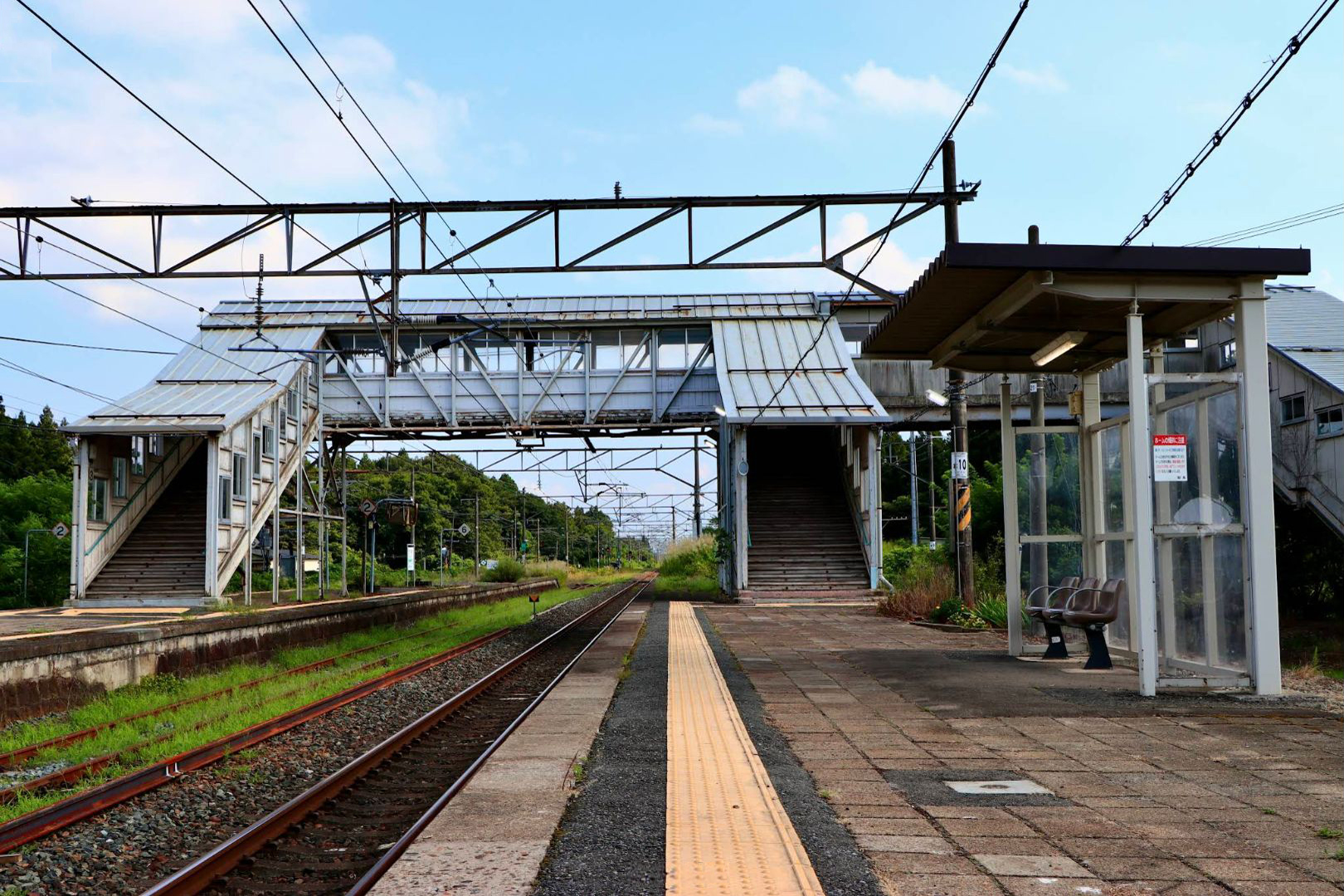 単式ホームは駅舎に面しておらず、駅舎と両ホームは跨線橋で連絡している。