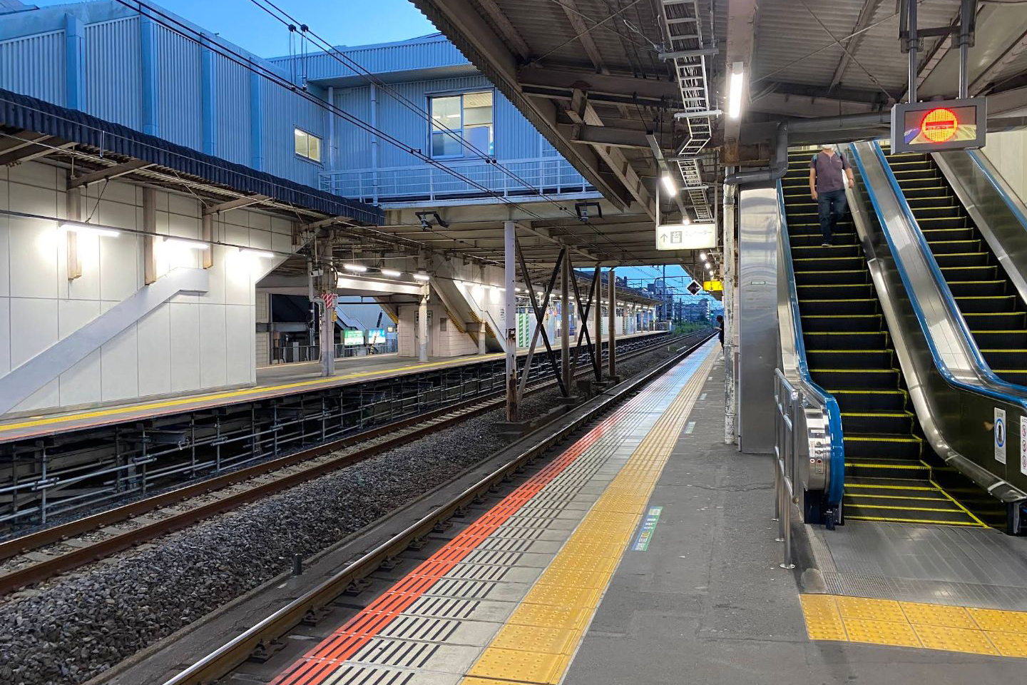 駅構造 島式ホーム2面4線を有する地上駅。緩行線(各駅停車)と快速線が1面ずつ使用している。快速線ホームは、ホーム階と改札コンコース階を結ぶ階段、エスカレーター、エレベーターが設置されている。