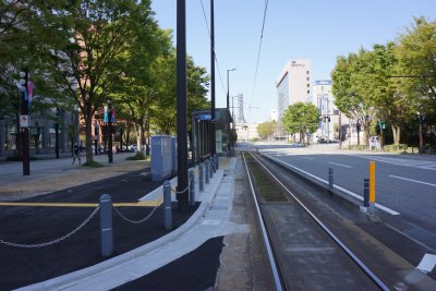 当停留場の前後の路線は、道路中央ではなく道路の端を走っているため、当停留場は歩道から直接出入りできます。