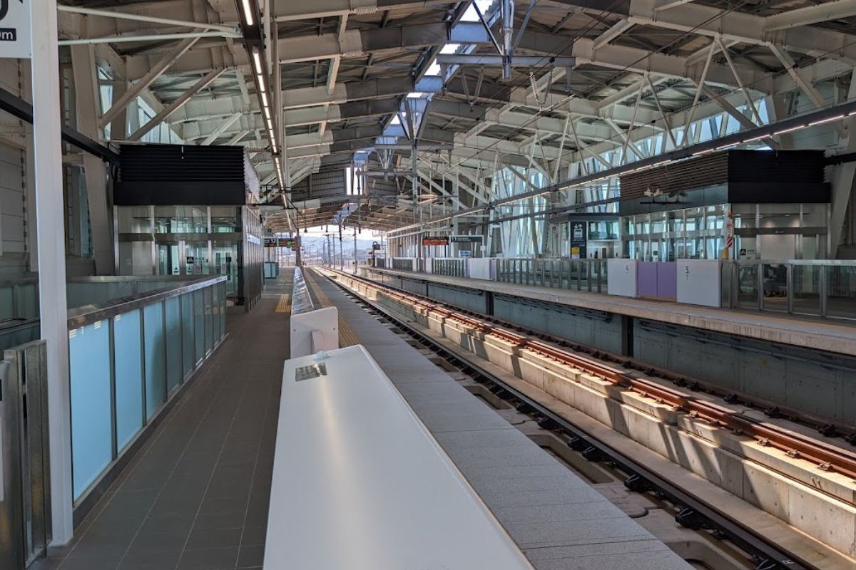 - 相対式ホーム2面2線を有する高架駅である。待避線がないため可動式安全柵が設置されている。
