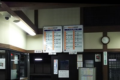 ・2004年3月より快速「しなのサンライズ」の停車駅となっていますが、ホーム有効長が6両分しかないため、平日の169系9両による運転時には、ホームからはみ出す後ろの3両がドアカットされていました。ただし車両が変更された2011年6月以降は解消されています。 |