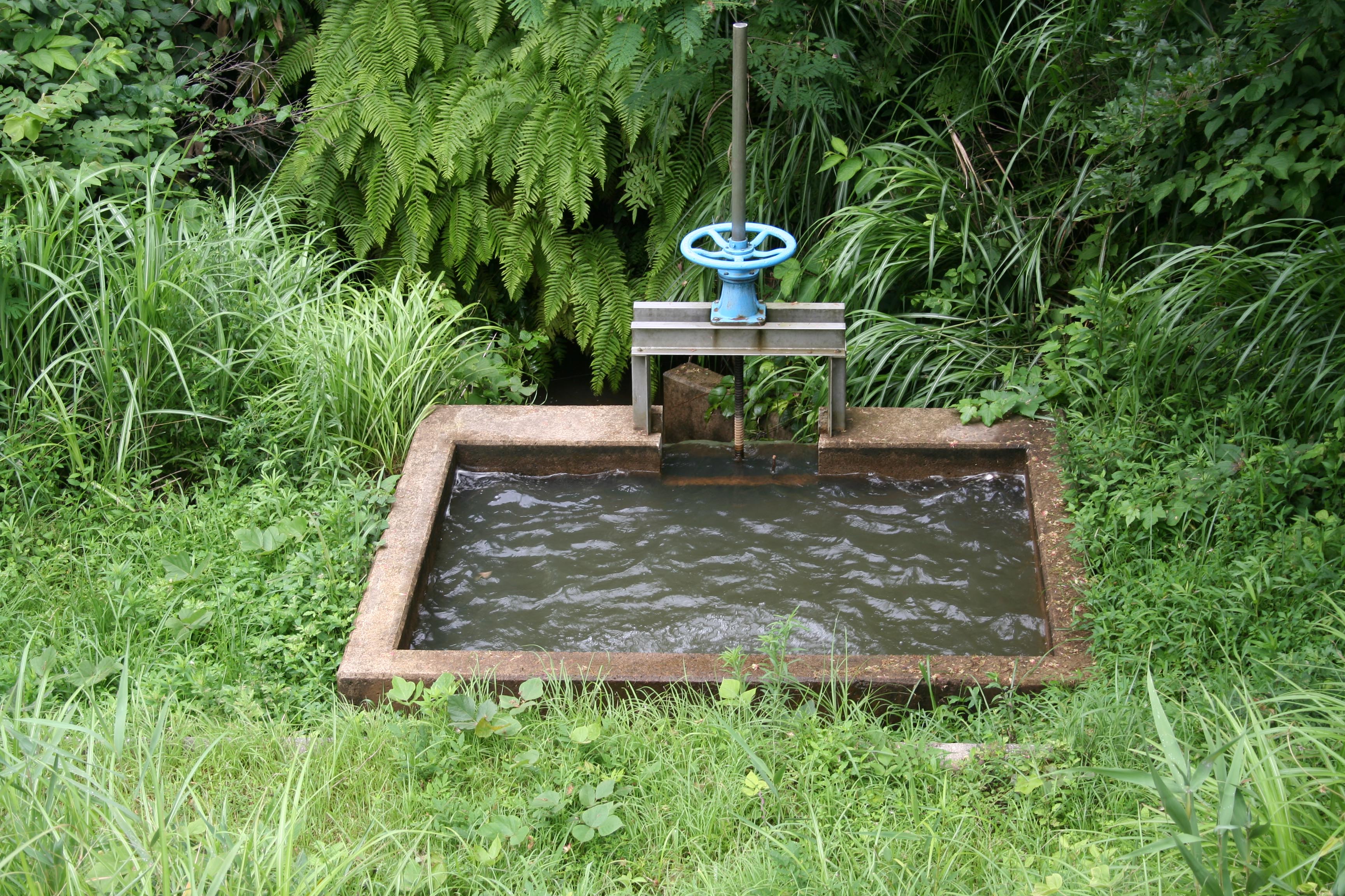 このダムには、自由越流式洪水吐がありますが、取水設備ははっきりしません。たぶん水面下にあるのでしょう。ダム直下には灌漑用水を供給するための設備がありますので、どこからか取水しているのは間違いないでしょう。