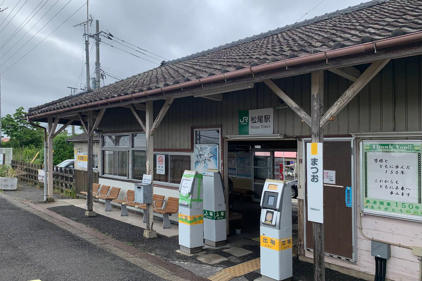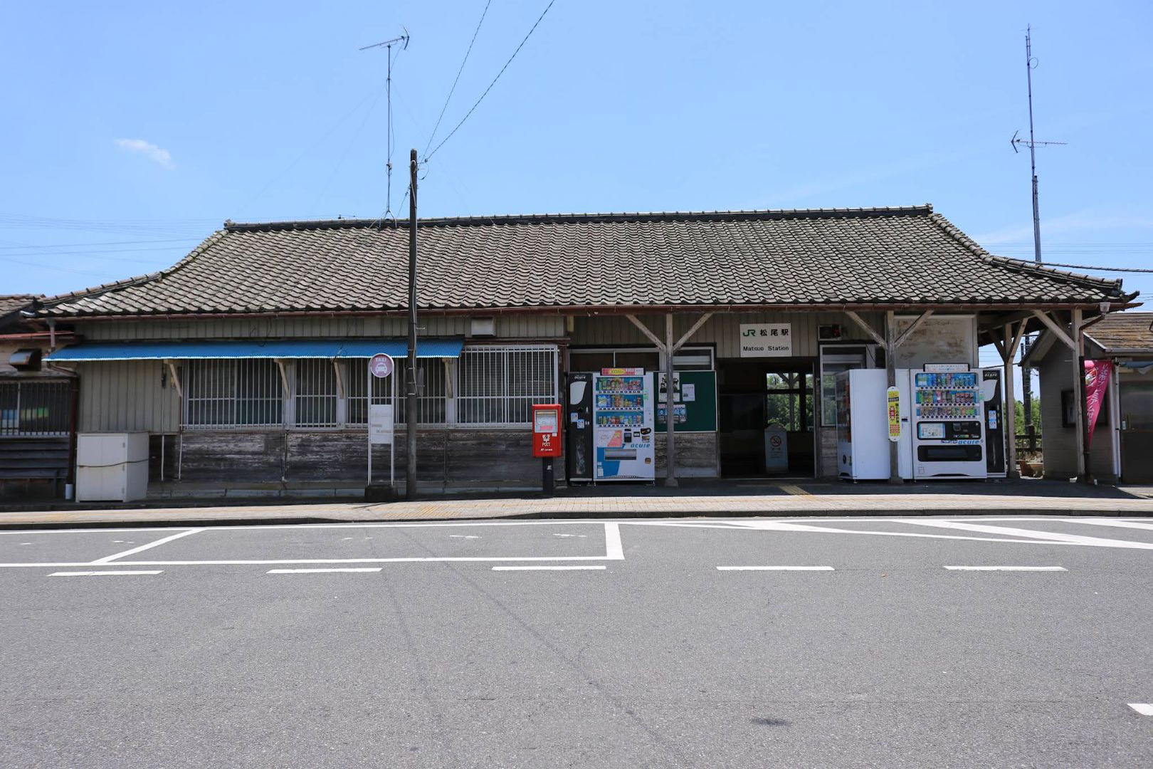 木造駅舎は開業当初からのもので木造平屋建て瓦葺きとなっており、大きな入母屋屋根が特徴的である。