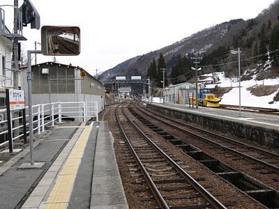 • ホームに接する線路のほかにも、ホームに接しない線路(側線)が東側(猪谷駅方)の上下線それぞれに付属しており、保線車両用の車庫が設置されている。