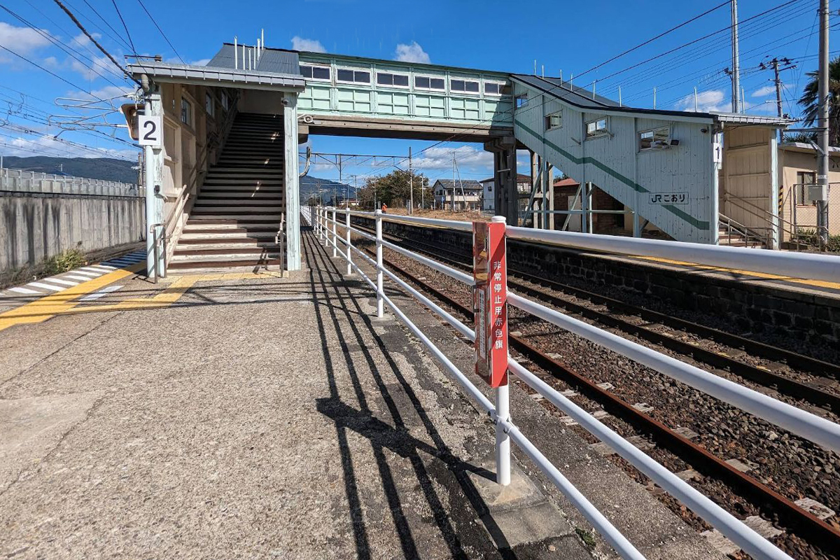 互いのホームは跨線橋で連絡している。1番線ホームに接して駅舎がある。