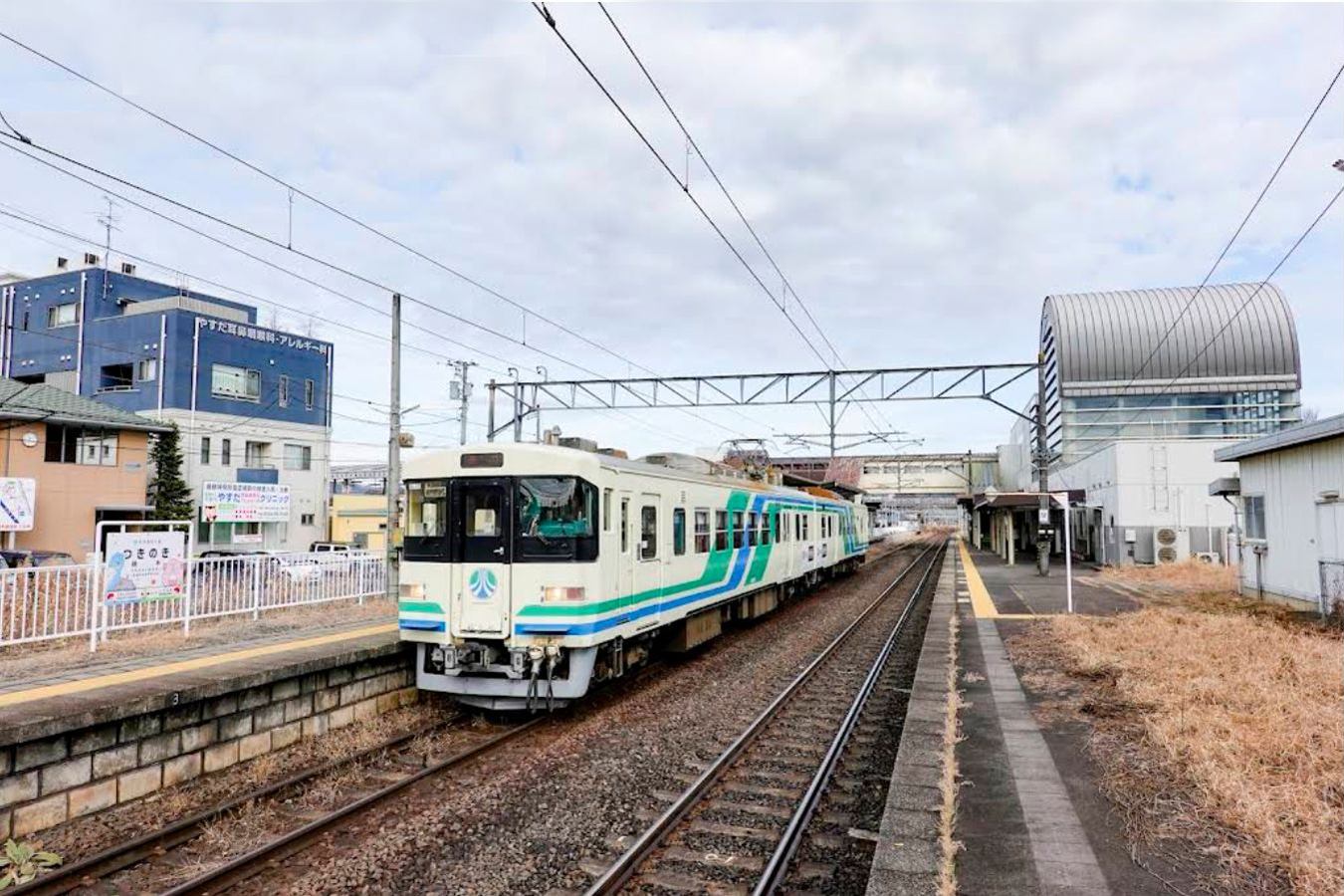 阿武隈急行線の列車は、東北本線の上下線の間を通り、白石川を橋梁で渡ってから、東北本線の上り線を立体交差でまたいで角田方面に向かう。