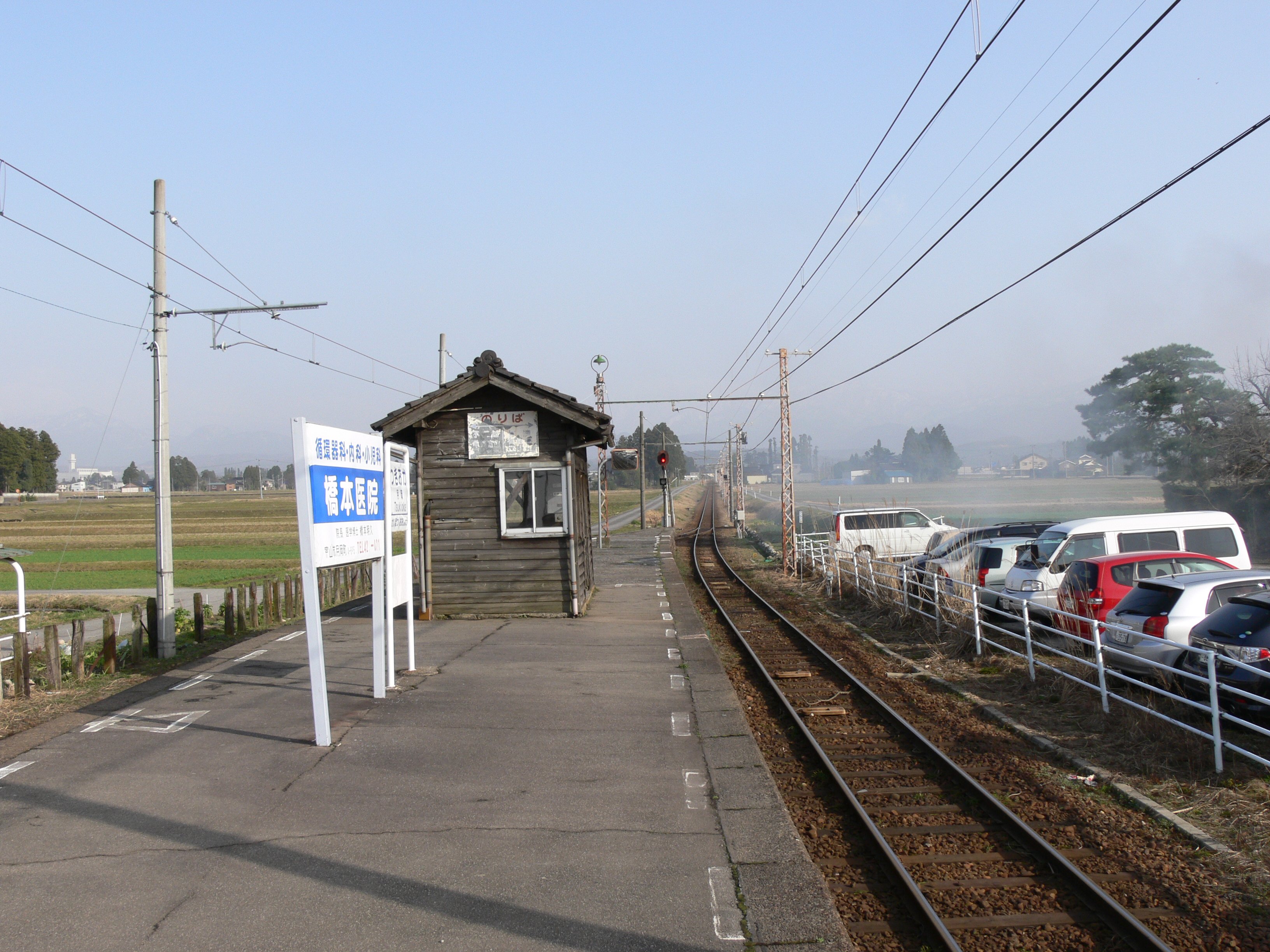 この月岡駅では電車の離合は右側通行になっています。木造駅舎を有します。