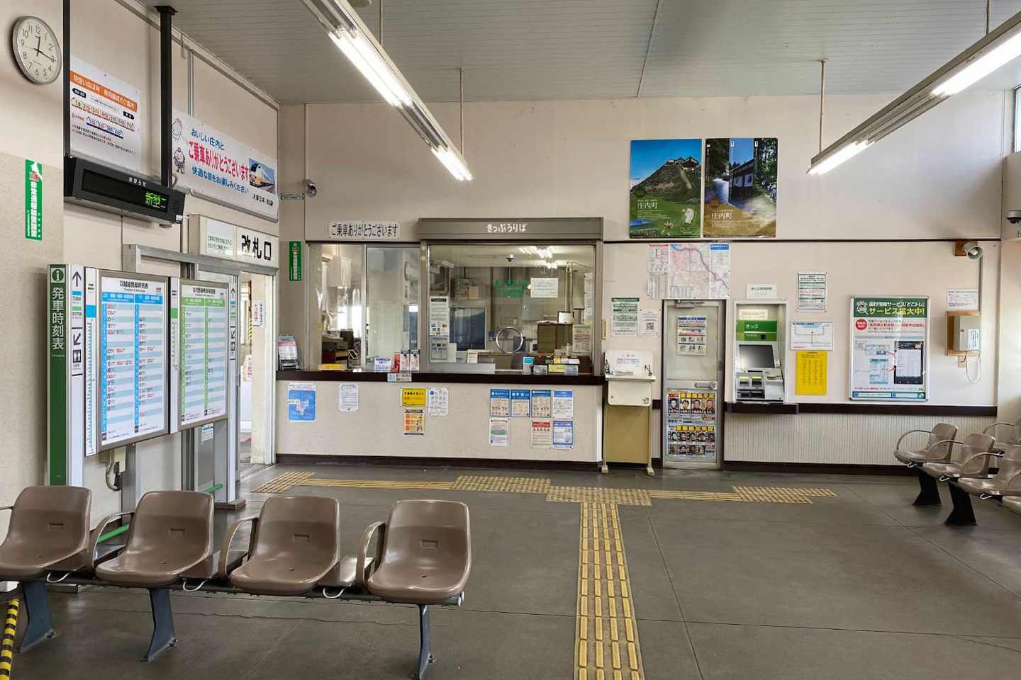 みどりの窓口、自動券売機設置。駅舎内で「あまるめホッとホーム」 が庄内町の特産品・土産品を販売している。