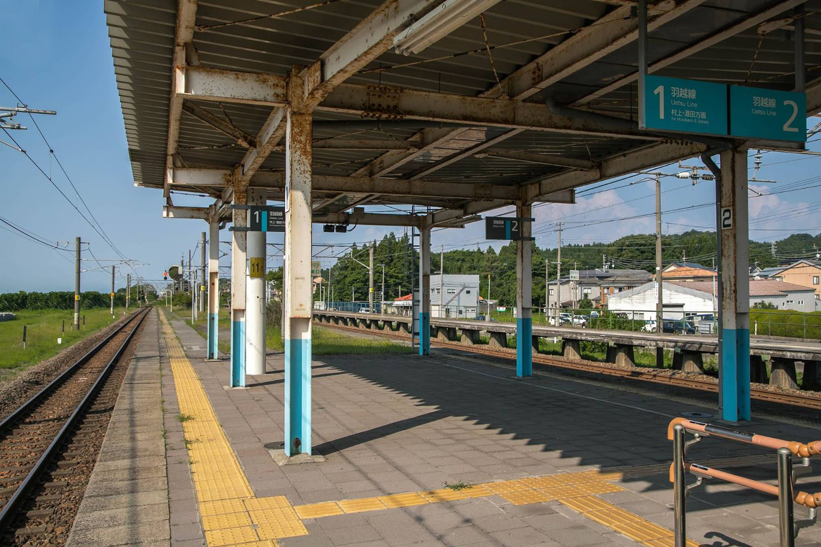 駅舎(西側)と両ホームは跨線橋で連絡している。国道7号(東側)に面する側には東口が設けられている。