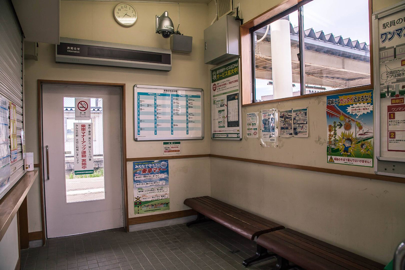 駅舎にはかつて使われていた事務室と閉鎖された出札窓口がある。