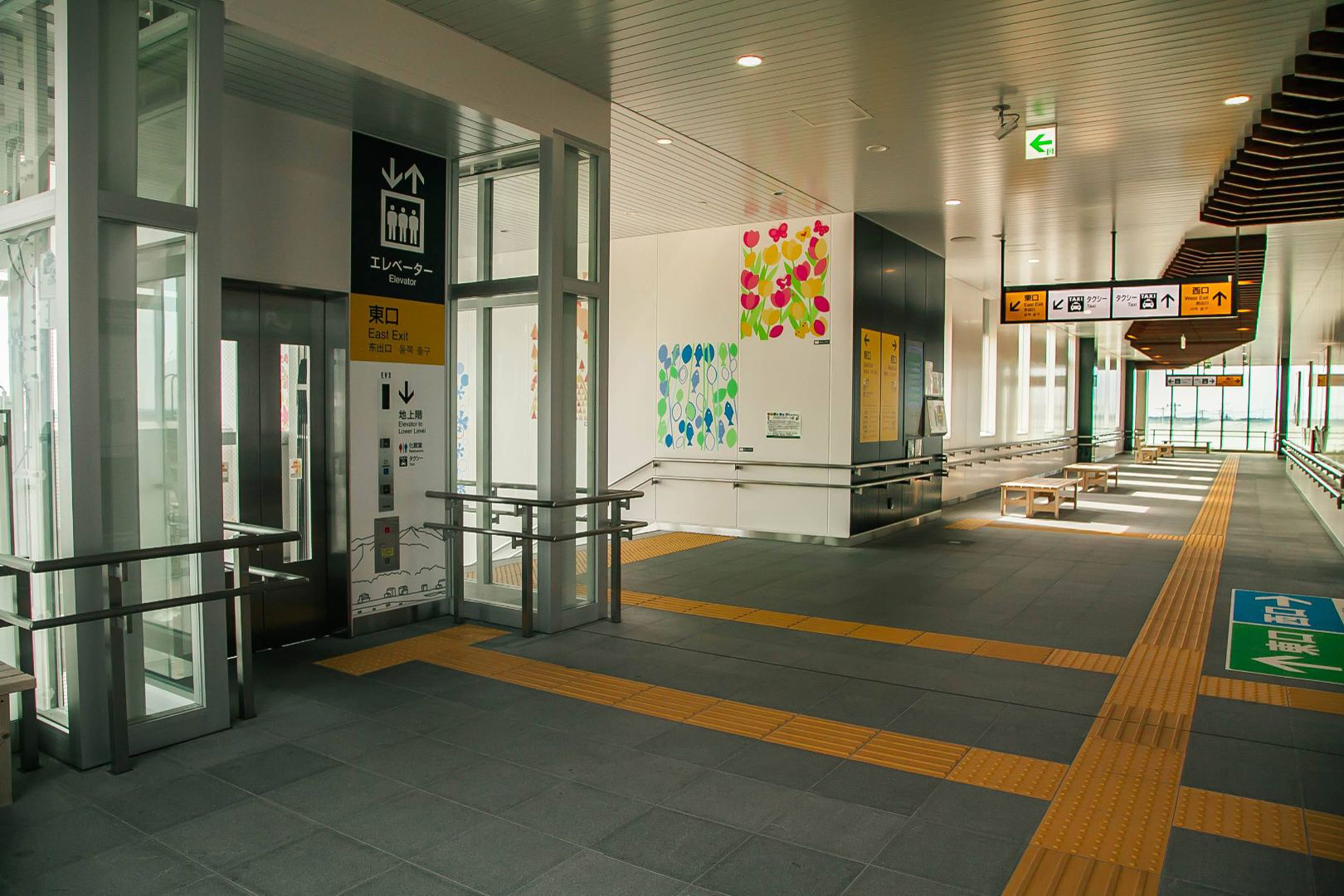 1階にはトイレ(東西両方)[14]のほか、東口側には待合機能や観光案内機能を備えた「観光交流室」があり、レンタサイクルの取り扱いもある。東口・西口のエントランス部と両ホームには階段[14]のほか、エレベーター[14]が設置されている。